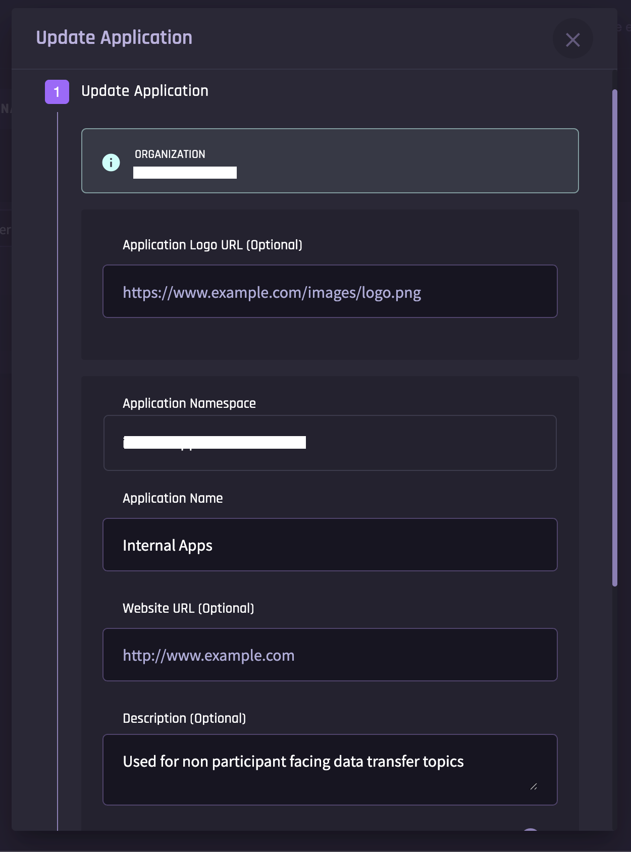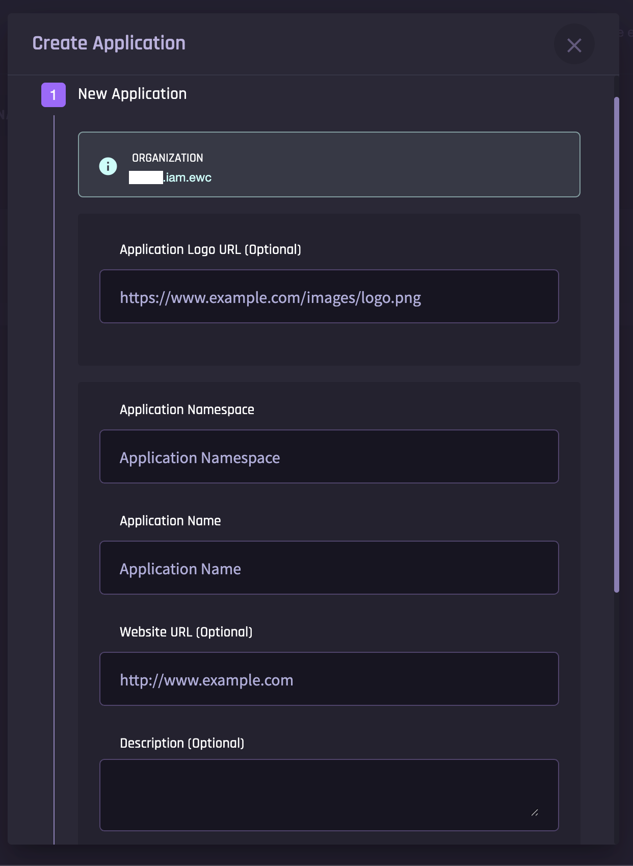 Note that any application namespace you define will automatically be created under an āappsā subdomain within your organizationās namespace. For example, if your organizationās namespace is āexampleco.iam.ewc" and you wish to create a new subdomain for an application you call "DERmanager," then your resulting namespace will be "dermanager.apps.exampleco.iam.ewc" (the "apps" subdomain is added automatically, to organize applications separately from other subdomains).