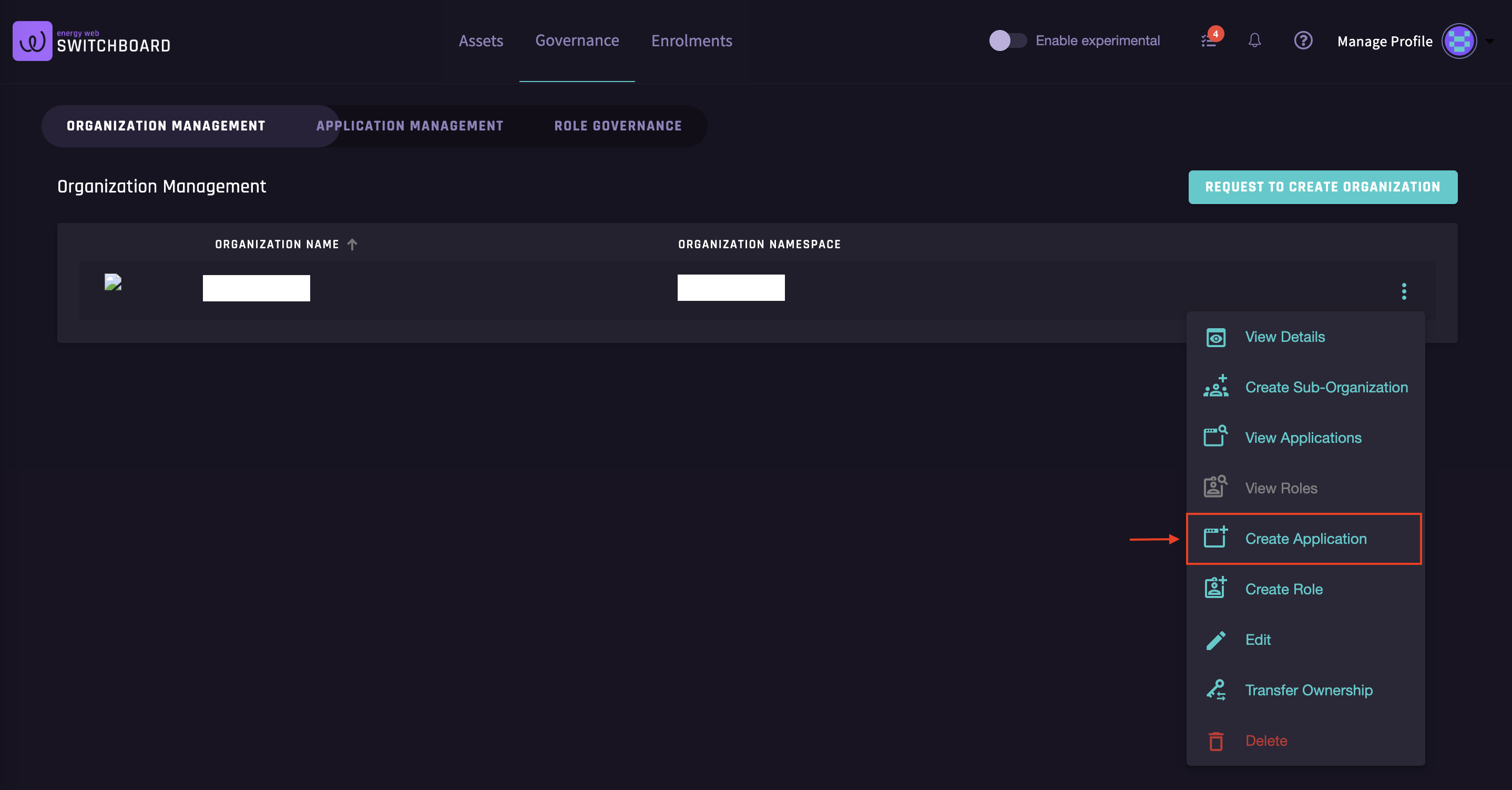 In the Organization Management page, click on the action button right next to the organization that you want to add a new application