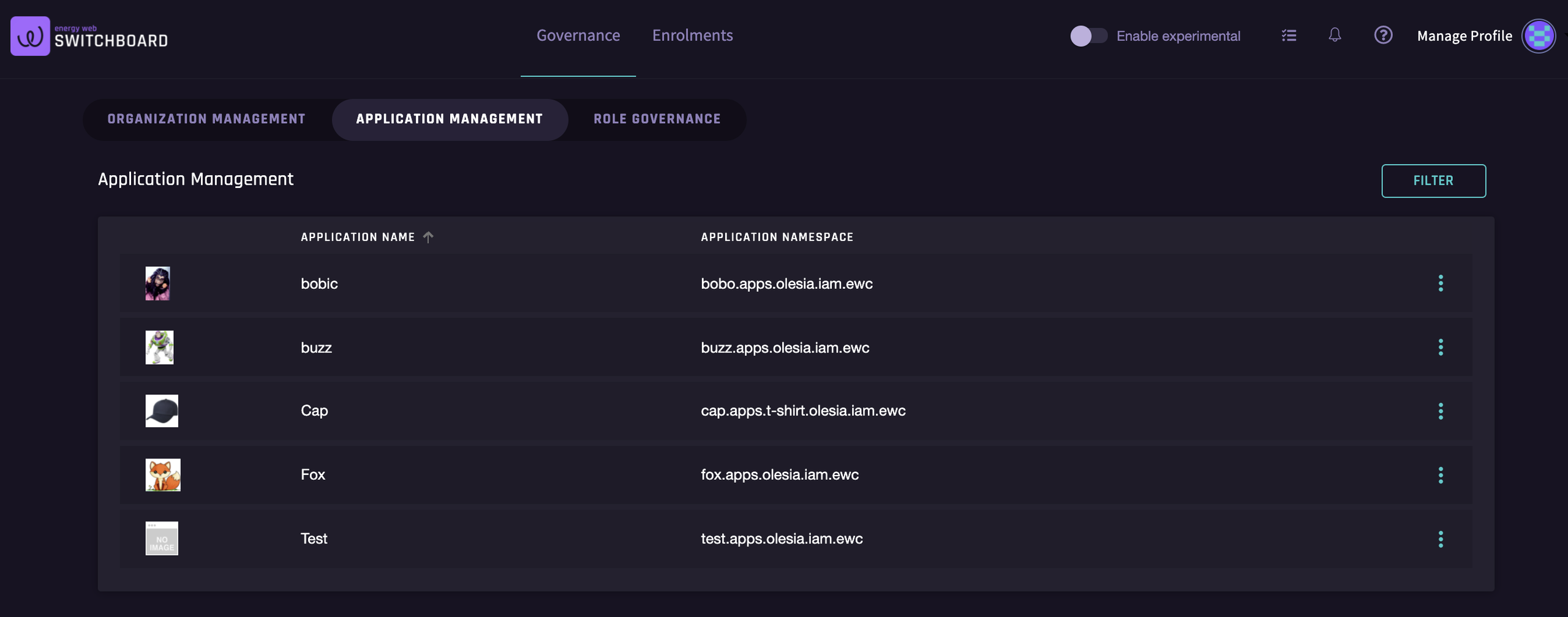You have several possible actions, similar to your options under organization management. Note that you also have the option to filter your applications by the organization; this may be helpful if, for example, different subsidiaries within your corporate umbrella wish to manage applications separately, but you as a designated super admin need to be able to view all of them.